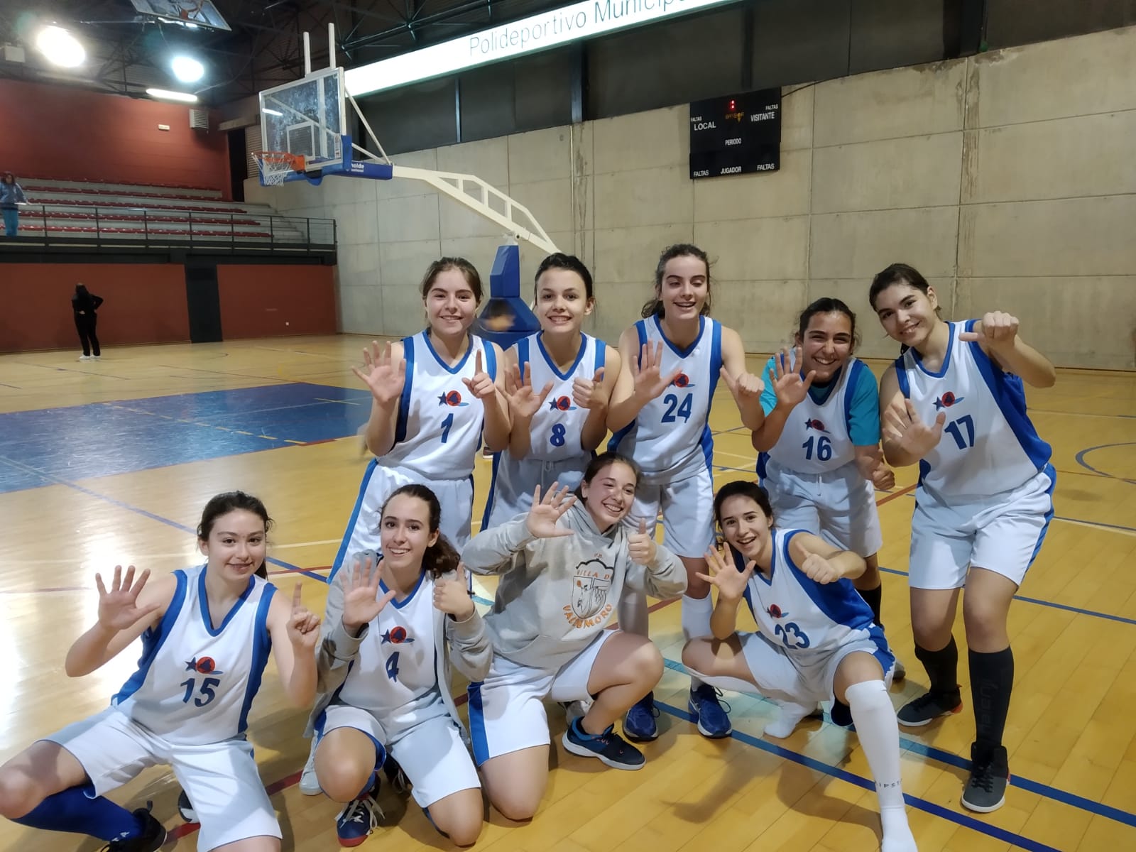 Pero esto son solo puntos un discurso que relata el transcurso de un partido. En verdad se vivía con mucha intensidad. Ocurrió de todo¸ una de nuestras jugadoras tuvo que abandonar el campo por un fuerte golpe que sufrió dirigiéndose al hospital, nos quedábamos con un pilar menos, pero no nos descolocó. Ahora teníamos mas motivos. Sabemos lo que es sufrir lesiones en el campo y no jugar por ello. Y somos un equipo que apoya a sus componentes, es lo que le hace ser a este equipo tan especial. A tan sólo un minuto del final del partido teníamos un resultado de 24-31, perdíamos de 7. El partido estaba muy tenso no podíamos desaprovechar ninguna oportunidad. Nos hicieron falta, encestamos los dos tiros libres (26-31) , todavía había tiempo, recuperamos el balón sin darlas ni siquiera la opción de acercarse a zona, movimos la pelota dejando a una de nuestras jugadoras sin defensa que tranquilamente encesto un tiro que nos aproximaba al marcador y nos acercaba a la victoria (28-31) seguíamos creyendo en nosotras volviendo a recuperar el balón y encestando de nuevo (30-31). Hay que reconocer que la grada estaba viviéndolo con la misma intensidad con la que teníamos el convencimiento de que se podía ganar, y eso nos daba fuerzas. Se sentía el nerviosismo, haciendo unos pasos exagerados una de las jugadoras rivales nos devolvía la posesión. Fuimos a por la canasta de la victoria y encestamos (32-31). Estábamos por primera vez en el partido por delante en el marcador. Nuestra intensidad nos hizo cometer una falta a 30 segundos de acabar el partido que la rival encesto (32-32), solo teníamos una posesión. Pero esto aumento el ímpetu provocando una falta escandalosa el equipo rival que nos hizo ponernos a prueba… de nervios. Conseguimos anotar (33-32). Todavía quedaban 15 segundos, los suficientes como para penalizar cualquier fallo. Aguantamos a sus atacantes lejos del aro y sin faltas. Y Por fin sonó, ese silbato que nos otorgaba la muy merecida victoria. Partidazo del que todavía hoy se habla entre espectadores y entrenadores por la emoción con la que se vivió. Esto es Baloncesto. ¡¡¡Enhorabuena a todos!!!