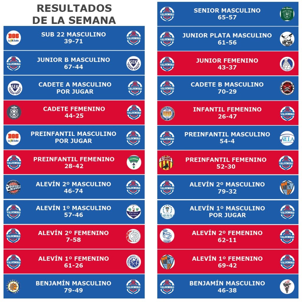 Resultados Jornada 14-15 Diciembre 16 diciembre, 2019 / cbvilladevaldemoroblog Estos han sido los resultados del pasado fin de semana de nuestros equipos: Comparte esto: Compartir en X (Se abre en una ventana nueva) X Compartir en Facebook (Se abre en una ventana nueva) Facebook Me gusta Cargando...