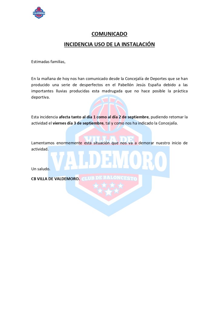 Comparte esto: Compartir en X (Se abre en una ventana nueva) X Compartir en Facebook (Se abre en una ventana nueva) Facebook Me gusta Cargando... Comunicado: Incidencia Uso de la Instalación 1 septiembre, 2021 / cbvilladevaldemoroblog / Deja un comentario