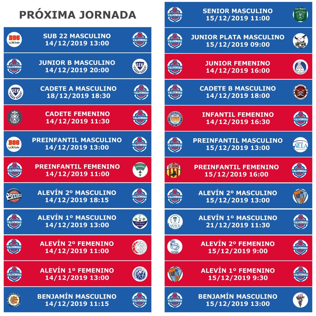 Aquí tenéis los partidos que se disputarán en esta última jornada del 2019 y que será jornada doble para las categorías desde benjamin a preinfantil. Os invitamos a que nos acompañéis y despidáis deportivamente este 2019 apoyando a animando a nuestros equipos. Os esperamos!